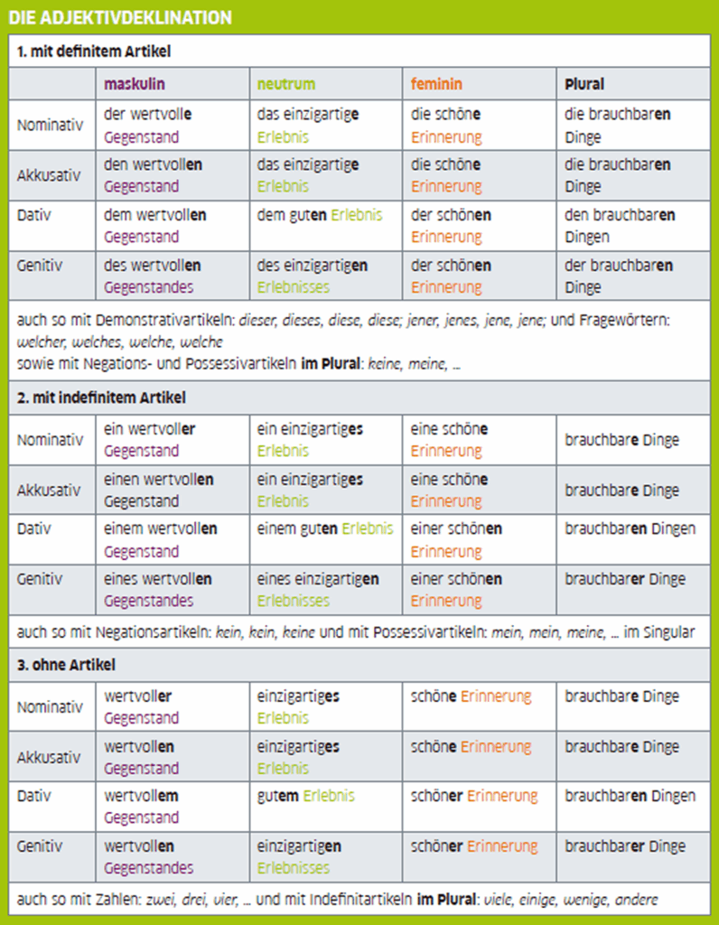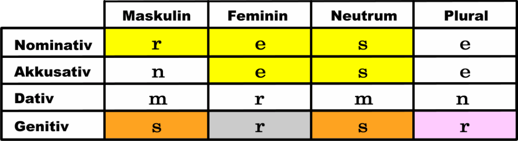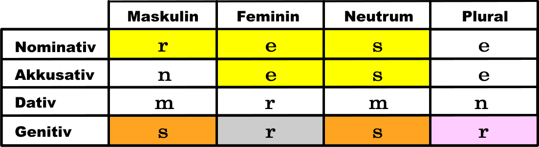 orange Zone: -en ; der Rest: Jeder Buchstabe, der die Deklination in der Tabelle anzeigt.